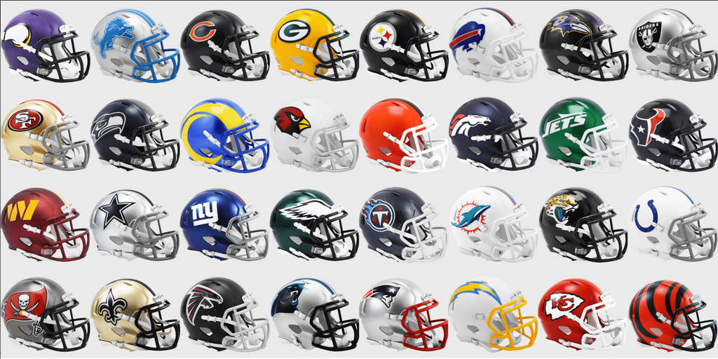 The entire 32 Team Set of Riddell Speed Replica Full Size Football Helmets. (Set includes all the current team helmets as of 2025 season) The ultimate NFL football helmet collectible, perfect NFL Riddell Speed Replica Full Size Football Helmets for autographs and collectors. Riddell Speed Replica Full Size Football Helmet with great graphics. Official NFL Riddell Speed Replica Full Size Football Helmets with official NFL team decals, extended mandible (jaw area) protection, a steel polyvinyl-coated face mask, chin strap, an integrated facemask attachment system and elliptical air vents. NFL Replica Speed helmet size medium measures: 12.75"(L), 9.25"(W), 9.75"(H). NFL Full Size Speed Replica Helmet. (NOT FOR WEARING)